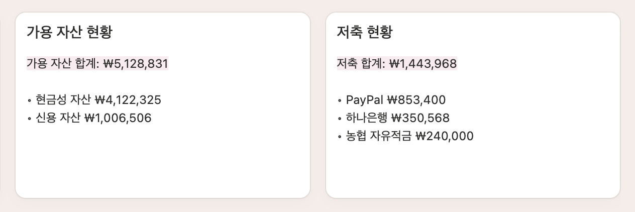가용자산/저축/부채/투자처럼 “흐름”이 아니라 지금 상태만 깔끔하게 보여줘요.
