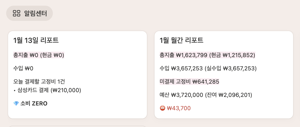- 일간 리포트: 그날 결제해야 할 고정비를 알려줘 결제일 놓침을 줄여줘요