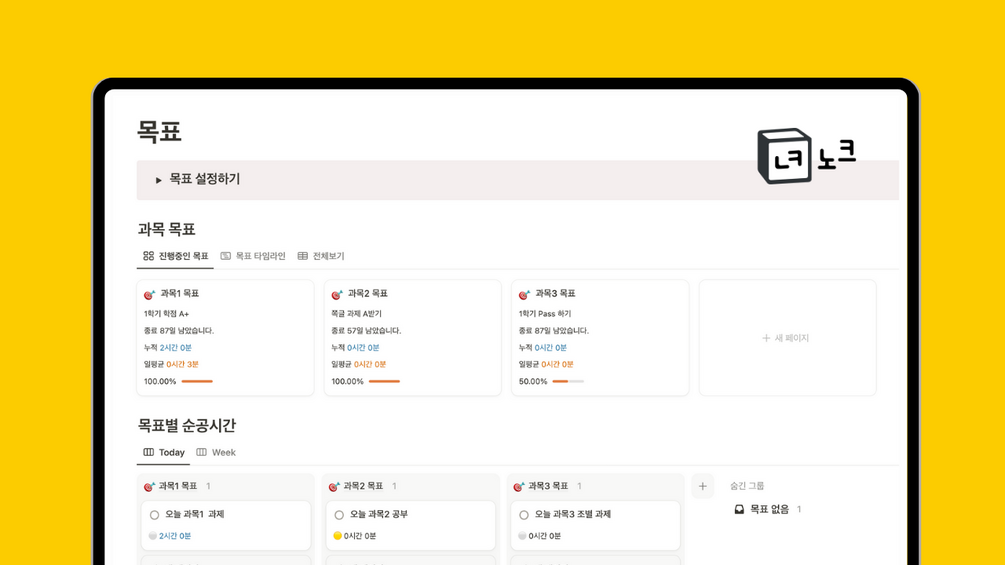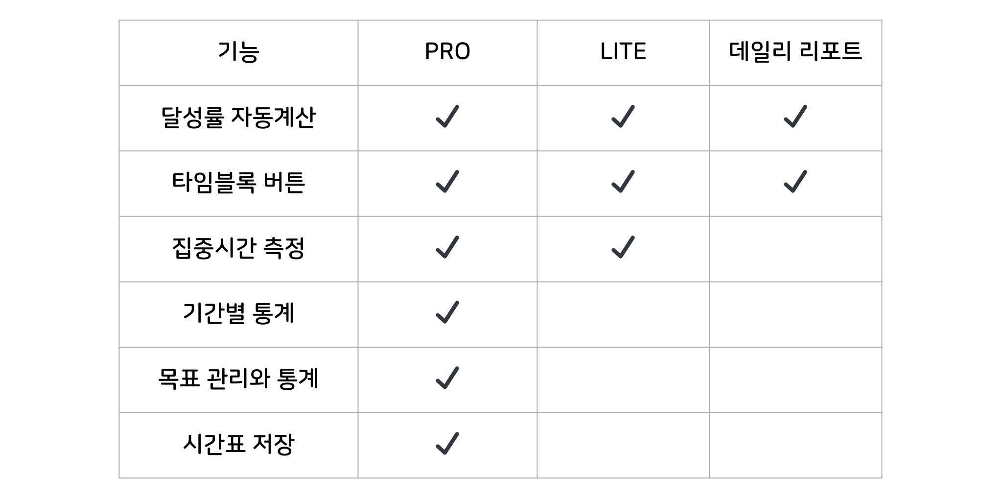 구체적이고 평가 가능한 목표를 설정하고, 기간 내에 달성할 수 있도록 도와줍니다. 목표 하위 할 일의 완료율과 목표별 순공 시간(누적, 일평균)을 확인할 수 있습니다.