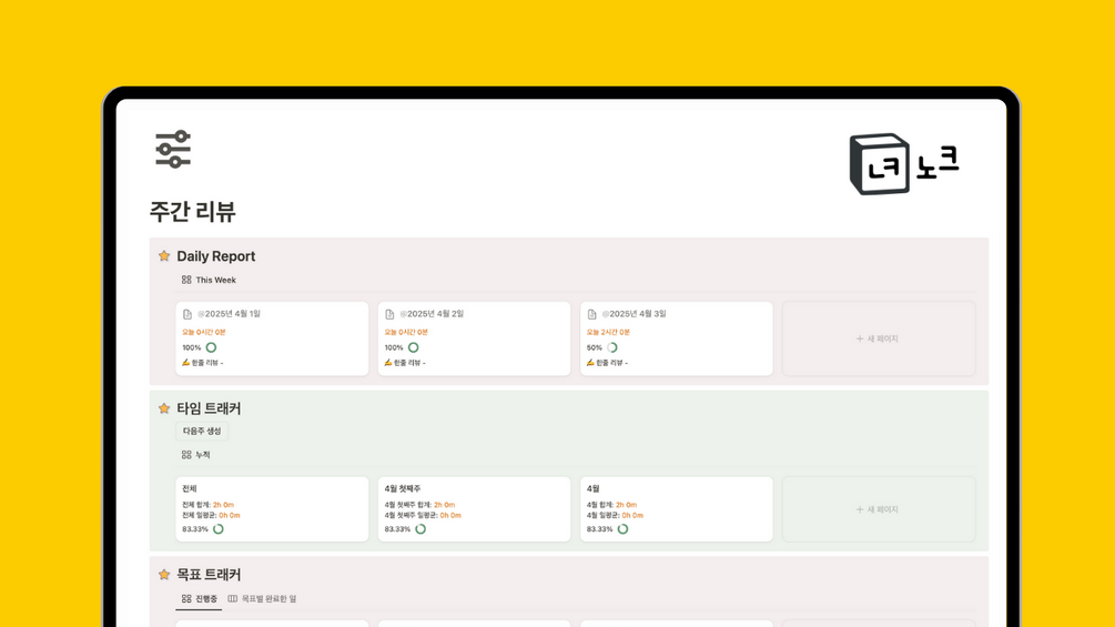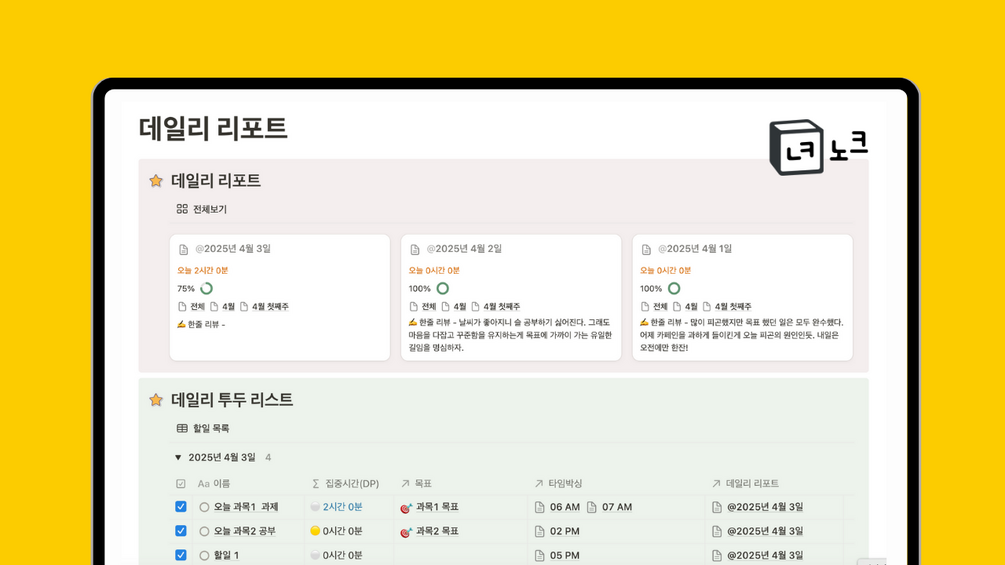 버튼 하나로 그날의 시간표, 할 일, 데일리 리포트를 생성하고 자동으로 연결해 줍니다. 완료 체크 및 시간 측정 만으로도 데일리 리포트에 자동 기록되도록 설정되어 있습니다.